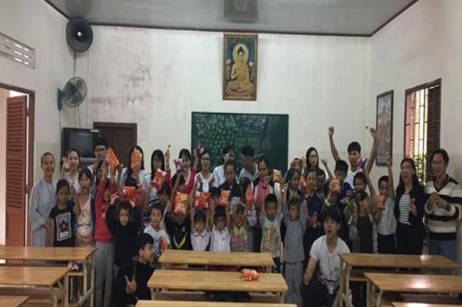 Các bạn sinh viên Trường Đại học Tôn Đức Thắng và lớp học tình thương tại Chùa Kim Sơn